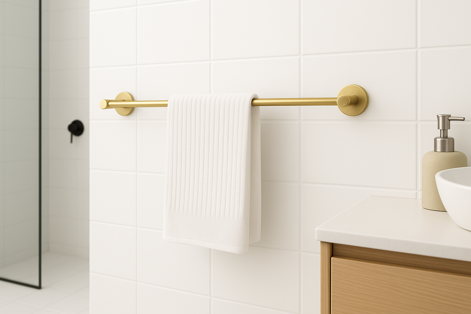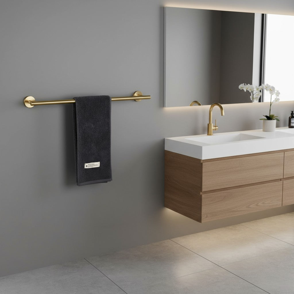 Barre porte-serviette en or brossé, conçue pour fixation murale. Fabriquée en acier inoxydable résistant à l’humidité et à la corrosion.