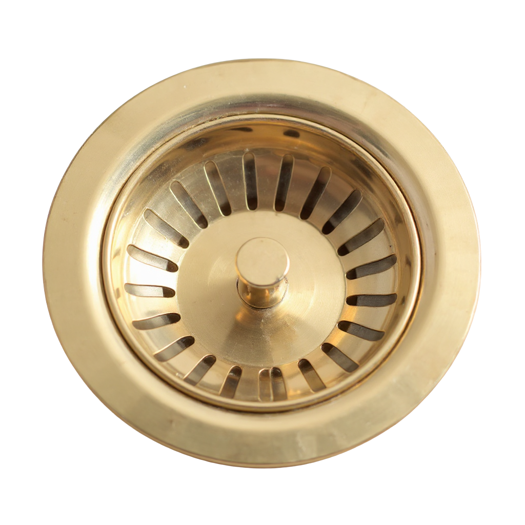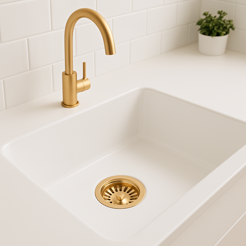 Bonde d’évacuation en laiton doré, conçue pour s’adapter à un robinet de la même finition.