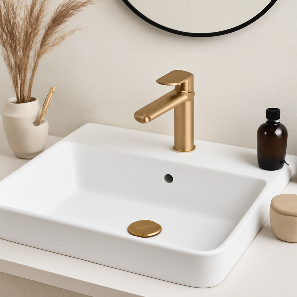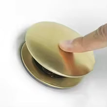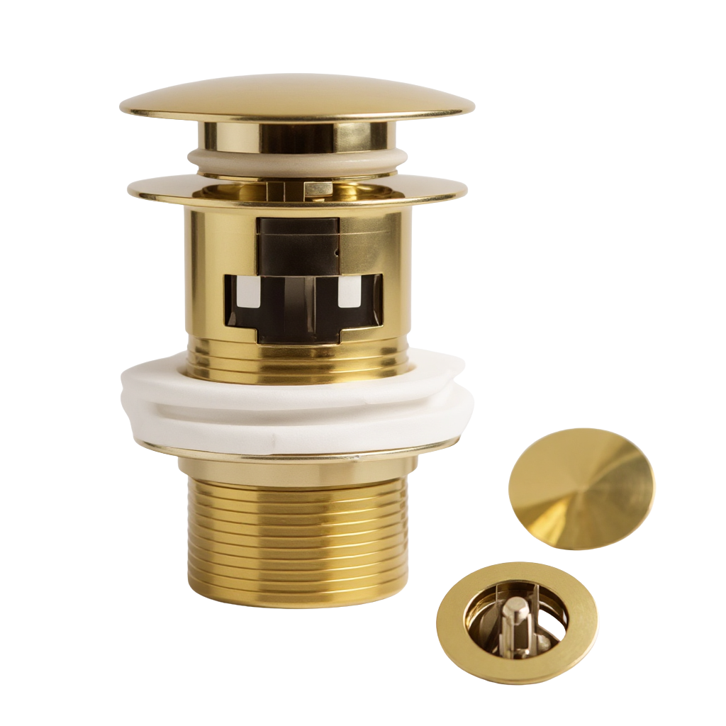 Bonde de fond avec finition or brossé, conçue avec ou sans trop-plein pour s’adapter aux vasques et lavabos.