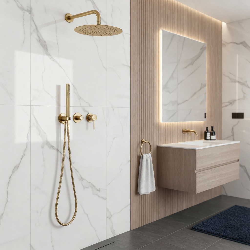Design élégant : L'association du doré mat et de lignes modernes créera une atmosphère chic et intemporelle, digne des plus belles salles de bains de luxe.