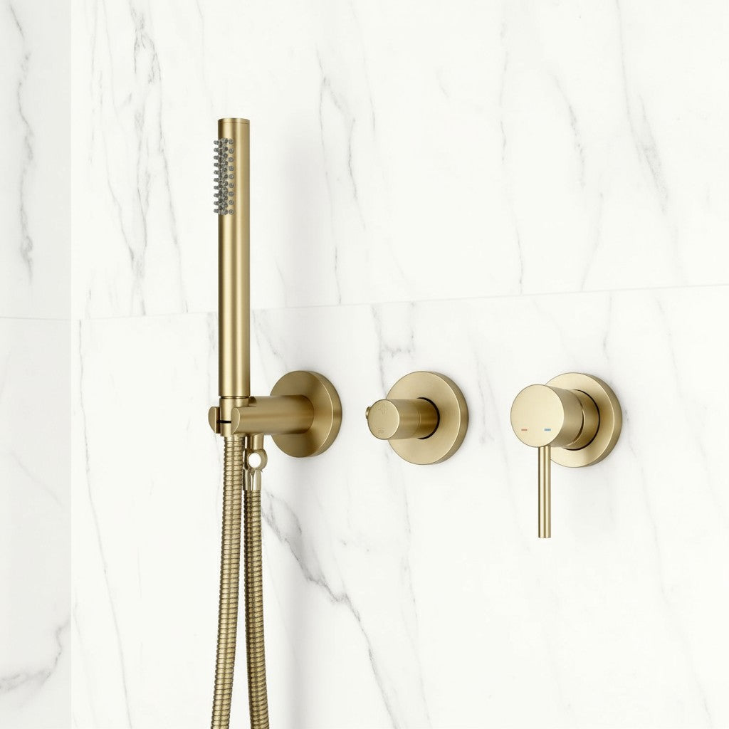 Colonne de douche encastrée en laiton avec finition or brossé. Équipée d’un ciel de douche effet pluie et d’une douchette à main. Le mitigeur intégré permet de régler le débit et la température de l’eau.