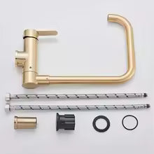 Robinet de cuisine pliable en laiton brossé. Sa conception permet de rabattre le robinet pour ouvrir une fenêtre située derrière l’évier.