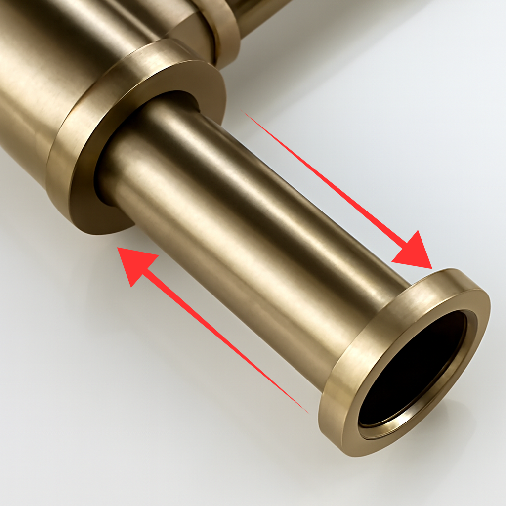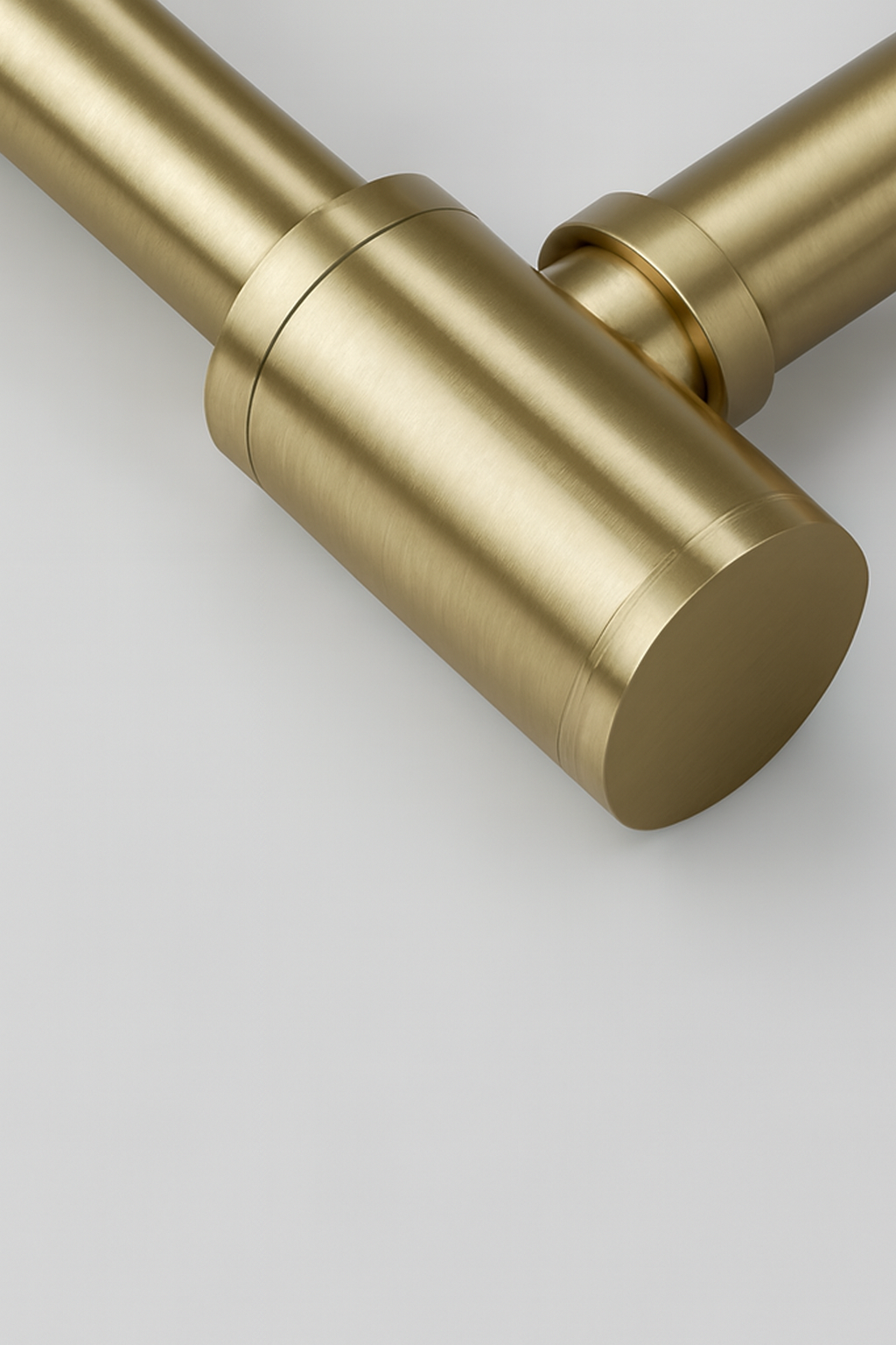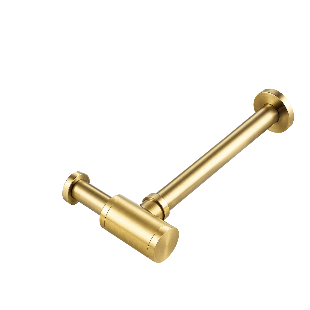 Siphon de lavabo en laiton avec finition or brossé, conçu pour s’adapter à la majorité des lavabos standards.